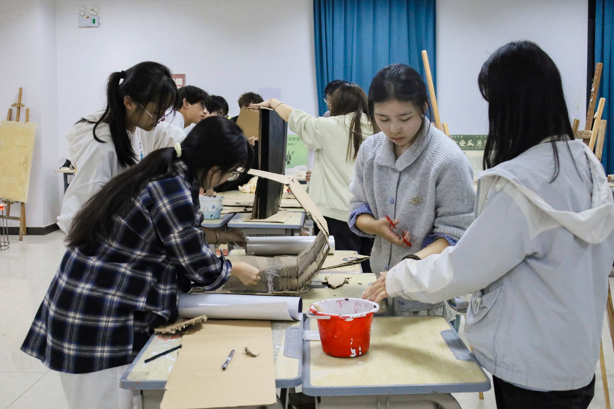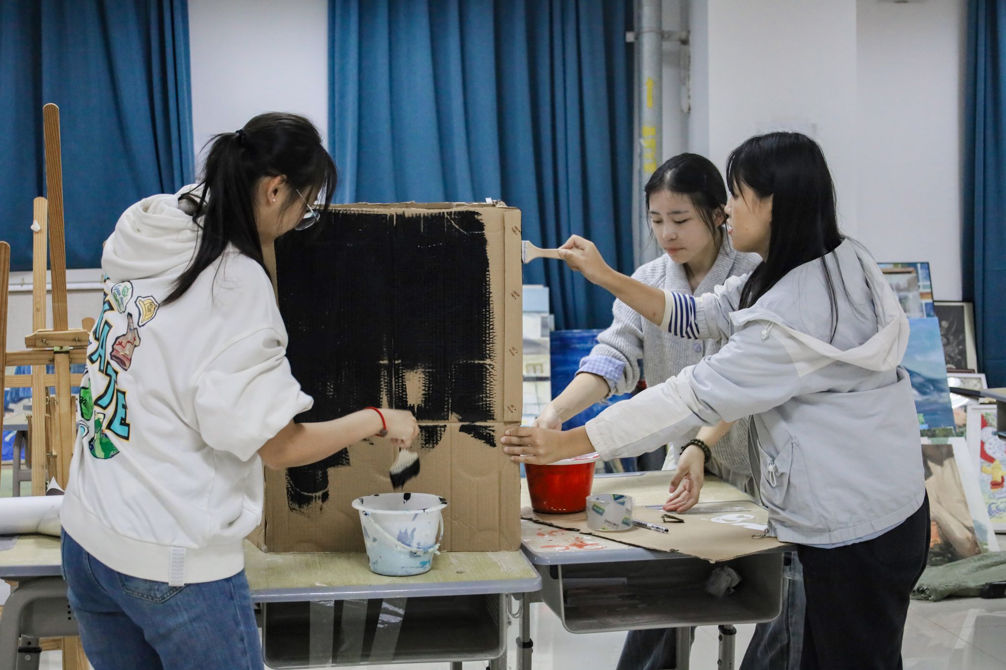 先将纸板进行内部粘贴,再在纸板的两侧进行裁剪,然后涂抹上我们美术所用的颜料,最后贴上设计学所用的一些软件图片。设计学专业2025(3)班的宋云飞按照标准的步骤,一丝不苟的制作着创意纸箱。他表示,大家配合默契,学长学姐组织得力且耐心解答疑问。“整个过程大家热情有干劲,从纸板粘贴、裁剪到颜料涂抹、贴软件图片,每一步都凝聚着团队的实践智慧。”宋云飞提到。