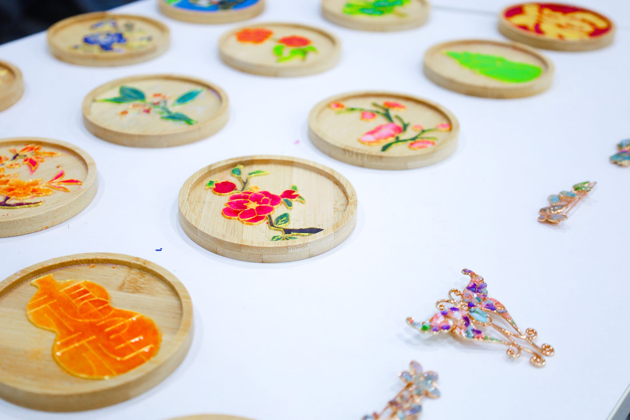免掐丝珐琅体验区内,色彩创意不断碰撞。桃花、石榴花、海棠、桂花等中式纹样铺满桌面,大家以彩砂为墨、以木片为纸,专注填色创作。起初,不少学生遇到配色不协调、上色不精准等问题,通过更换细笔、调整湿度、轻晃底板等小技巧,慢慢在实践中找到方法,创作渐入佳境。设计学专业2025(3)班的李晓悦坦言,自己曾因砂料外溢手足无措,看到有同学打破固有思路,将青花瓷元素大胆融入杯垫,还有人用满铺背景巧妙遮盖瑕疵,瞬间打开创作思路,“原来非遗也可以这么有创意,创作没有标准答案。”